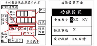 ⑵液晶顯示屏:顯示測量數據;電壓整定數值;定時提醒;倍壓節數等,顯示內容與您的操作有關。